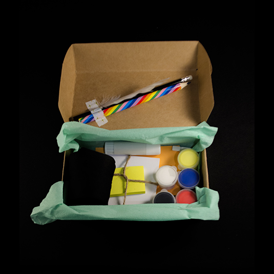 En el interior de la caja encontrarás: - Vela - Lápices - Pinceles - Acrílicos de 5 colores - Pegamento - Esponja - Hojas - 8 Papeles con diseño y colores - Cartón con forma de marco de fotografía - Post-it - Pluma - Sobre sorpresa con elementos en su interior *Los primeros 10 kit obtendrán un antifaz hecho a mano de regalo* Cada kit tiene un elemento sorpresa e incluye una sesión ritual creativa colectiva online.